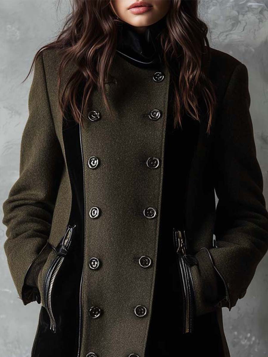 Make a bold statement this season with this military-inspired coat, crafted from a structured wool-blend for warmth and elegance. Designed with a sharp double-breasted front and striking black contrast panels, this coat blends utilitarian edge with refined tailoring. Sleek zippered pockets and a fitted silhouette ensure both style and practicality, perfect for modern winter wardrobes.