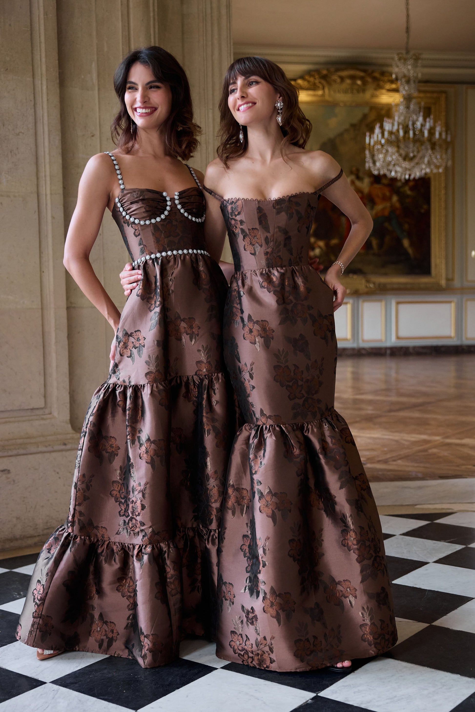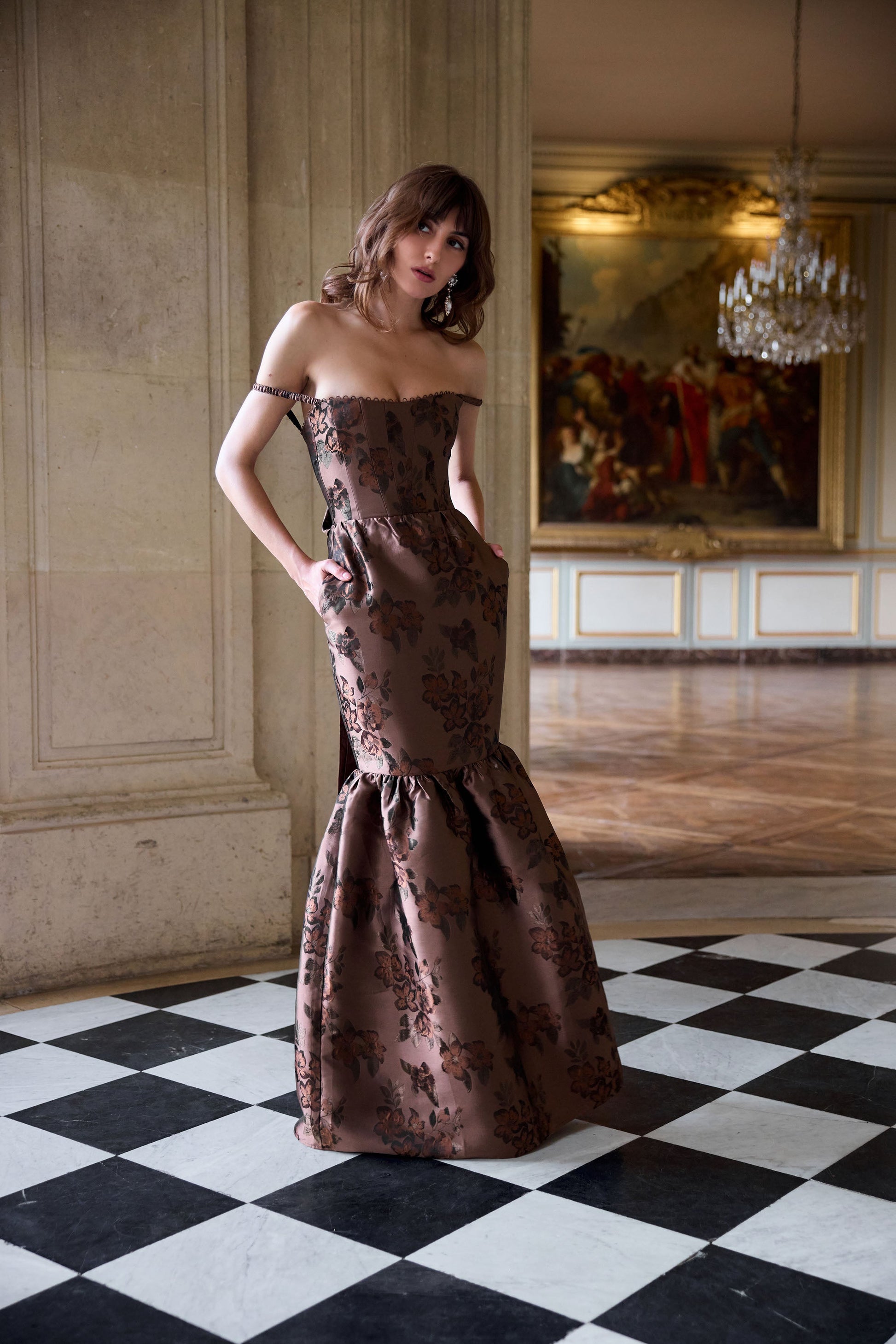 Introducing The Cherie Dress! She's a stunning off-shoulder full-length corset gown. She's made from our romantic Cocoa Baroque Floral brocade, which features brown flowers on a brown background. She features elegant boning details at the bodice, an invisible skirt zipper, and is accented with a beautiful bow-tie at the back. She's the perfect dress for any and all occasions!
