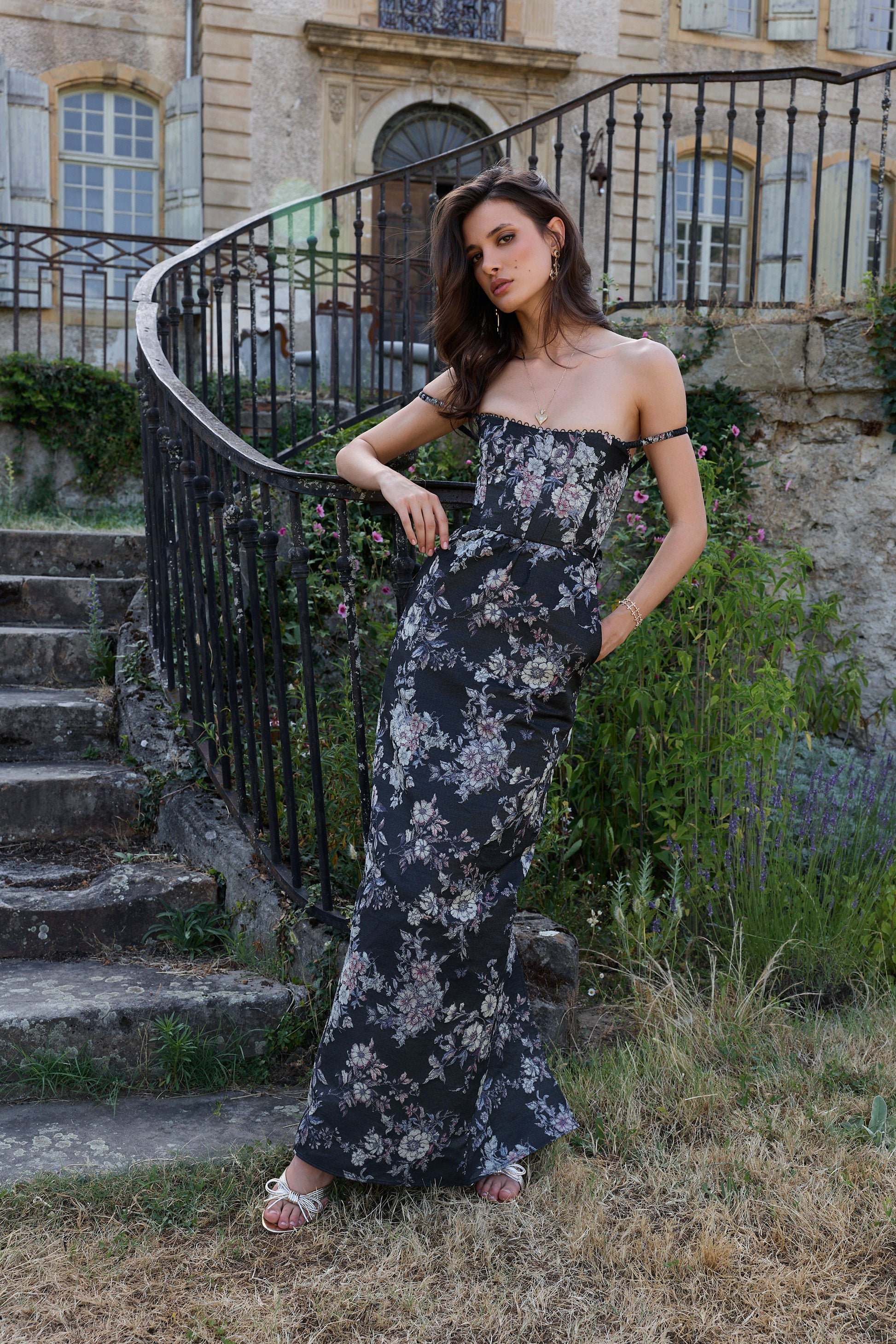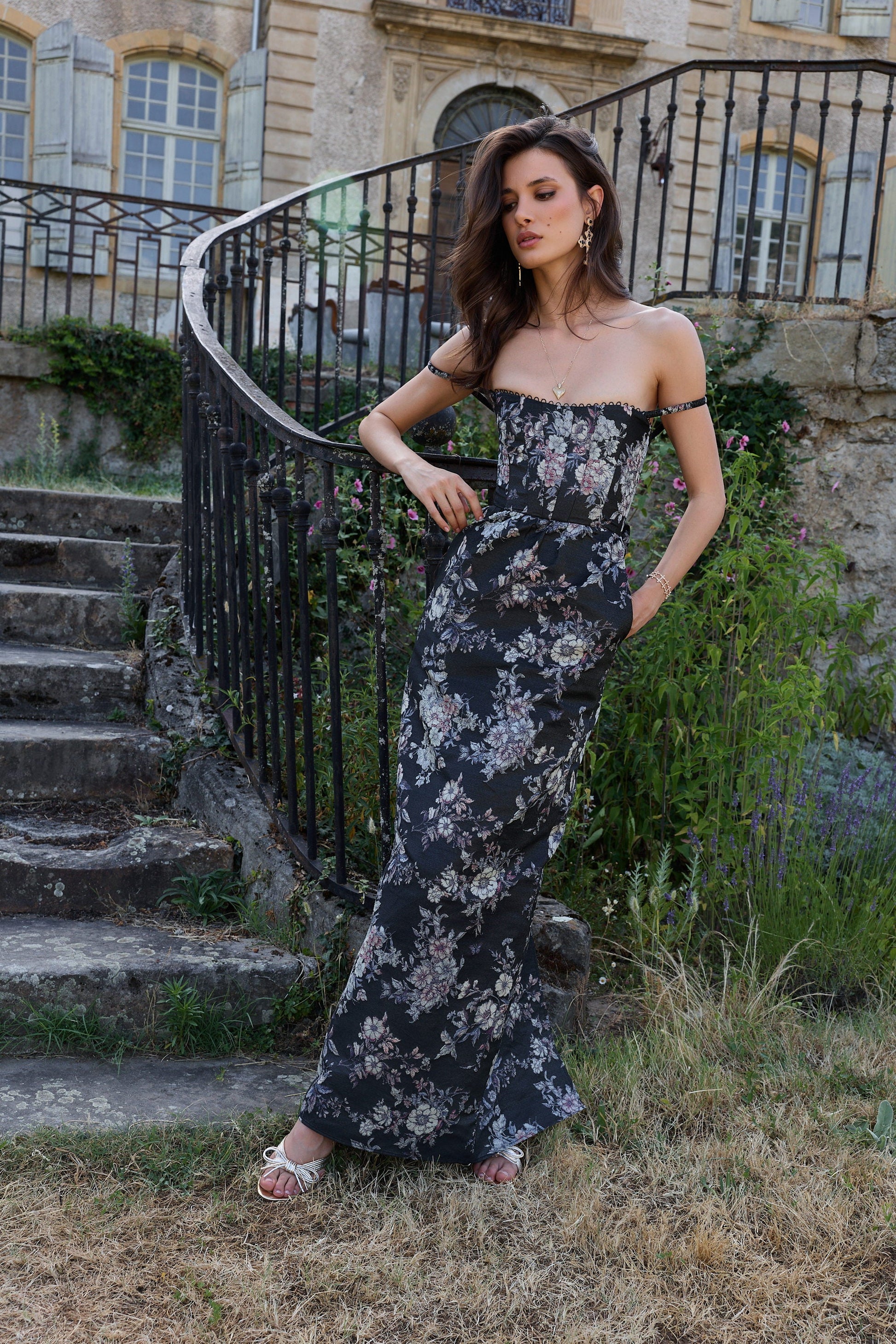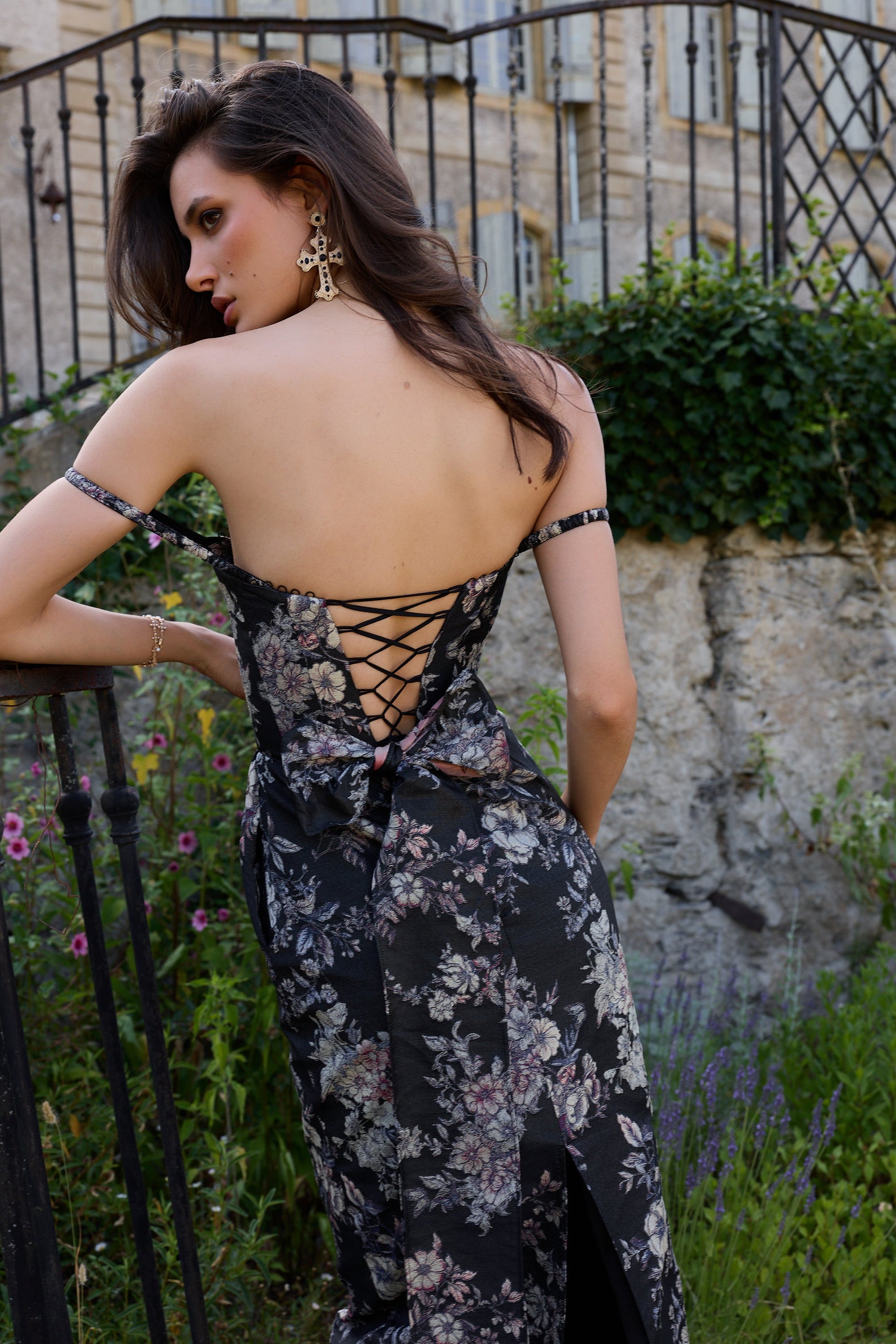 Meet Cheryl! She's a stunning off-shoulder, full-length corset gown. She's made from our romantic Black Lilibet Brocade, which features multicolor floral and butterfly details on a black background. She features a straight fit, elegant boning details at the bodice, an invisible skirt zipper, and is accented with a beautiful bow-tie at the back. She's the perfect dress for any and all occasions!