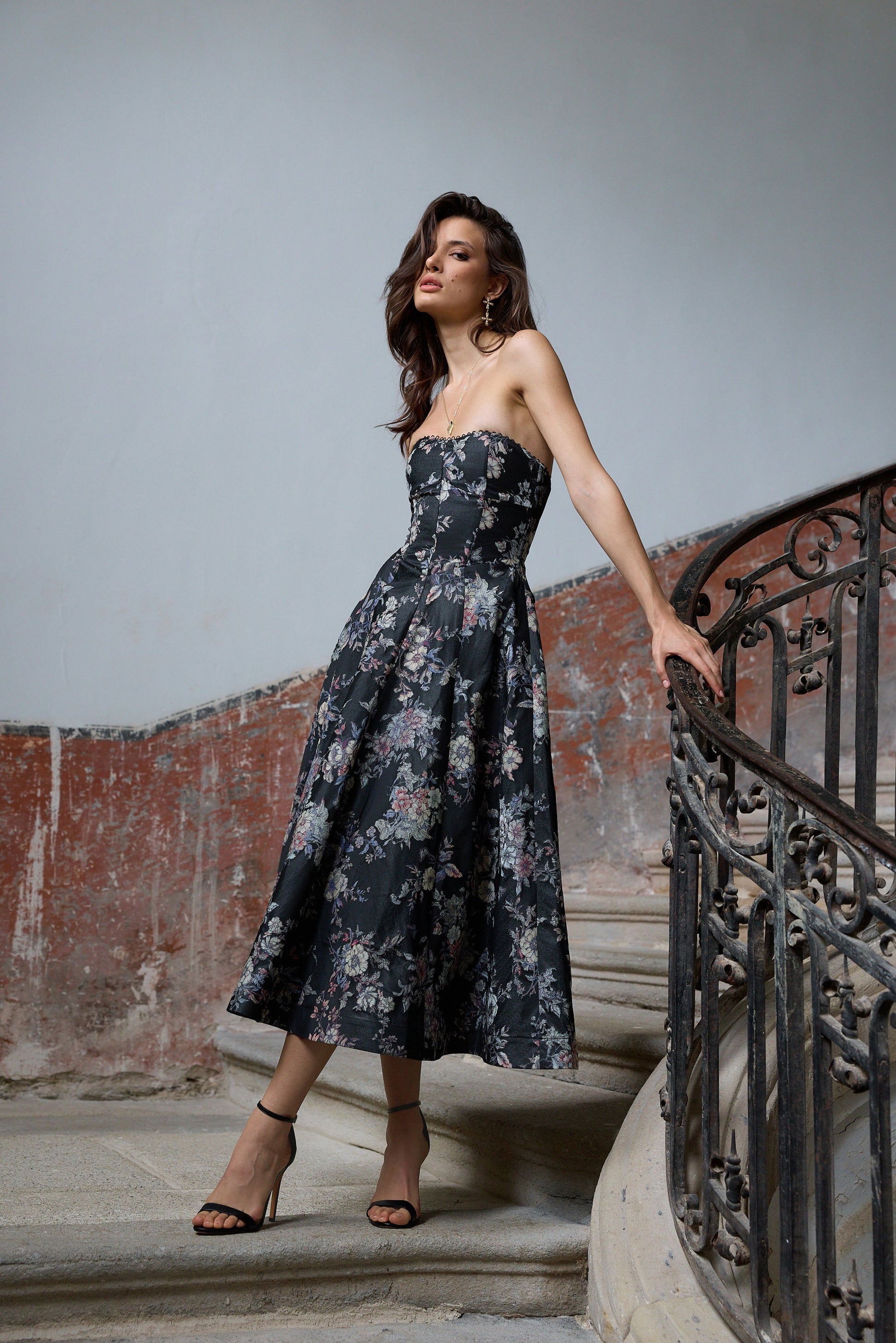 The Hazel Dress is a strapless midi-length dress featuring darling loop trim. She flaunts a corset bodice and a beautiful organza bow detail in the back. Made from our Black Lilibet Brocade, which features multicolor floral and butterfly details on a black background, she's the perfect dress for any occasion!