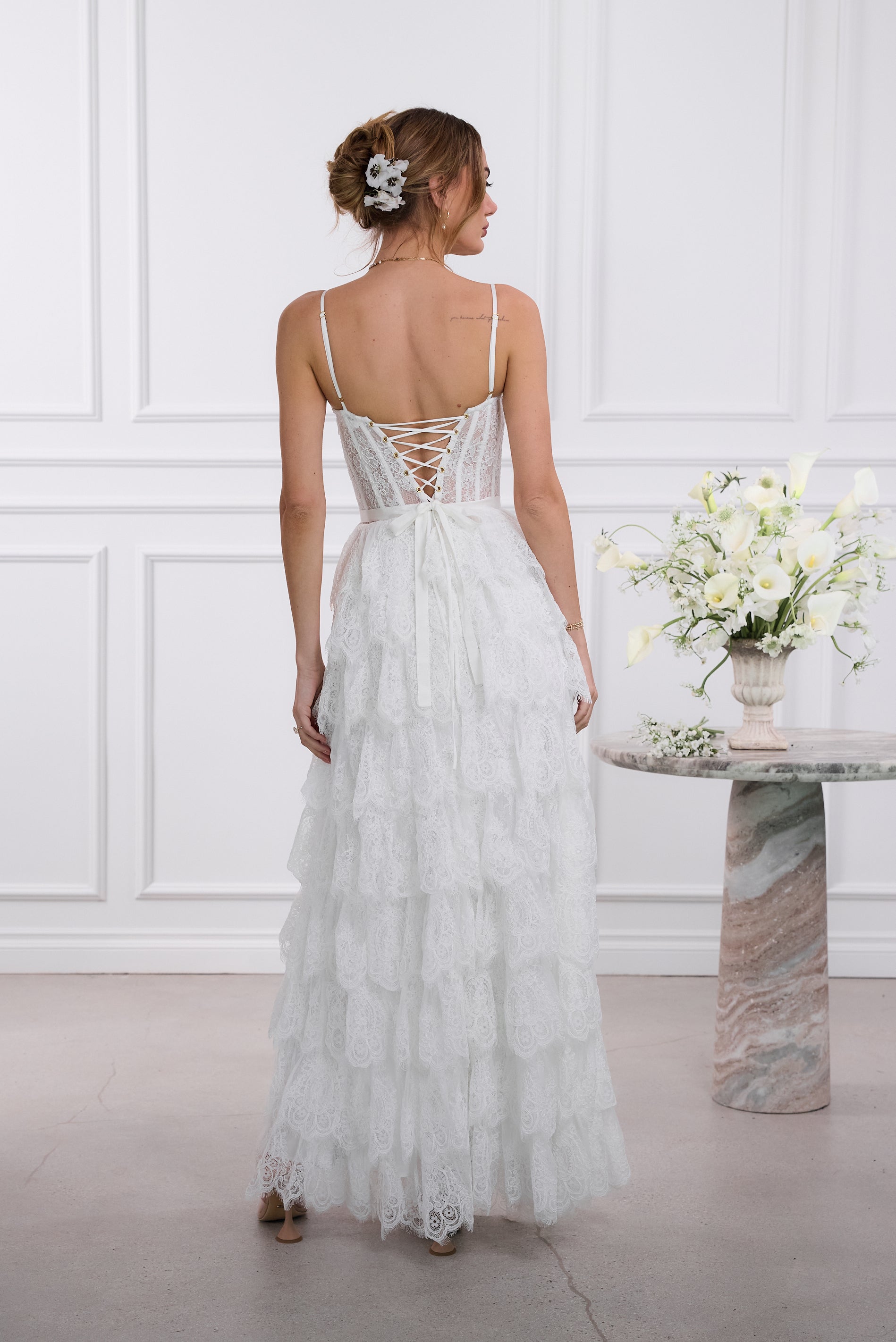 Meet Juniper! She's a full-length lace gown with cascading tiers. She's made in our embroidered White Chantilly Lace. She features a lace-up back, invisible zipper, and adjustable straps. Fall in love with her corset bodice, delicate scalloped corded lace detailing, and flirty side-front slit.