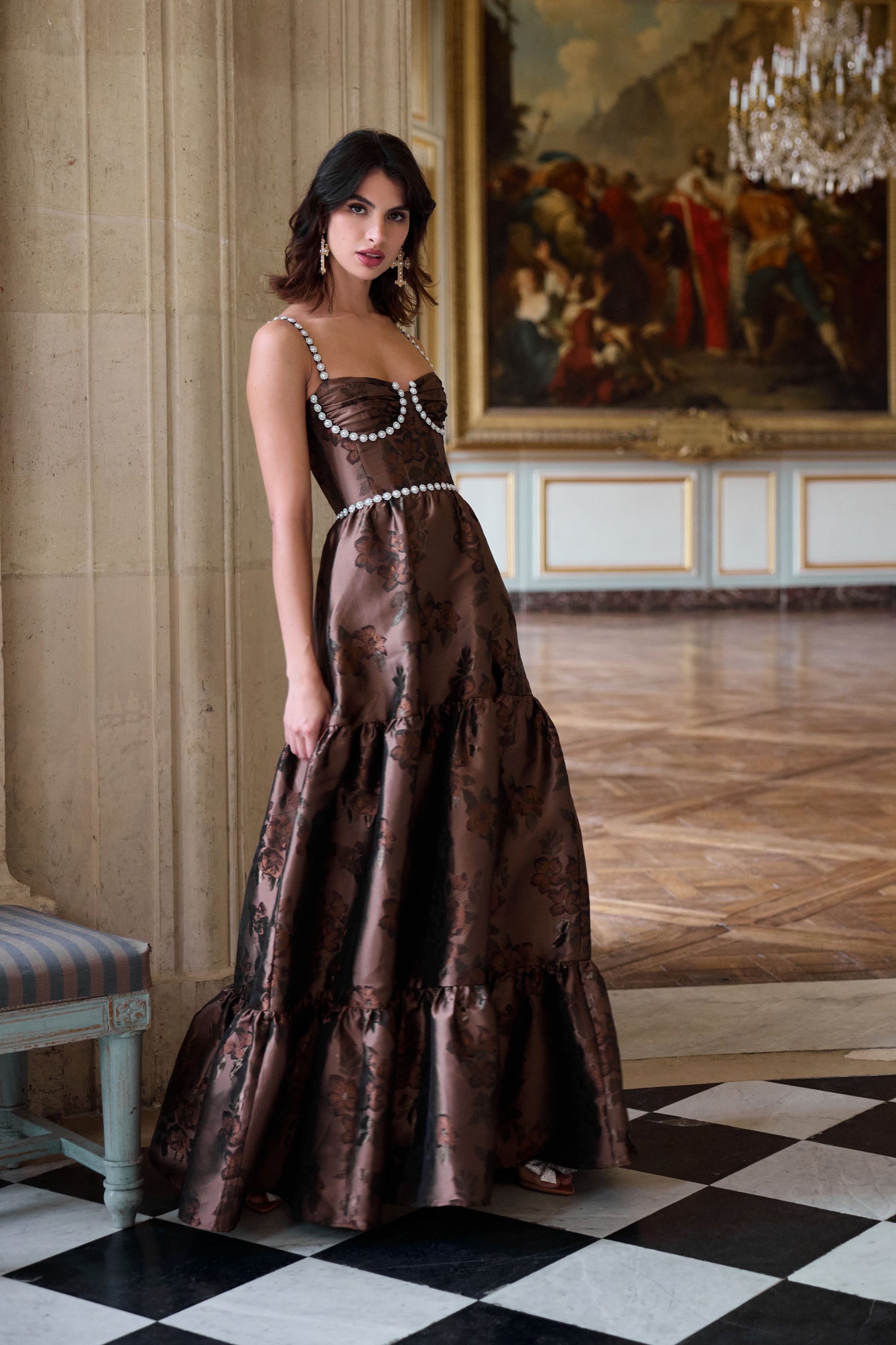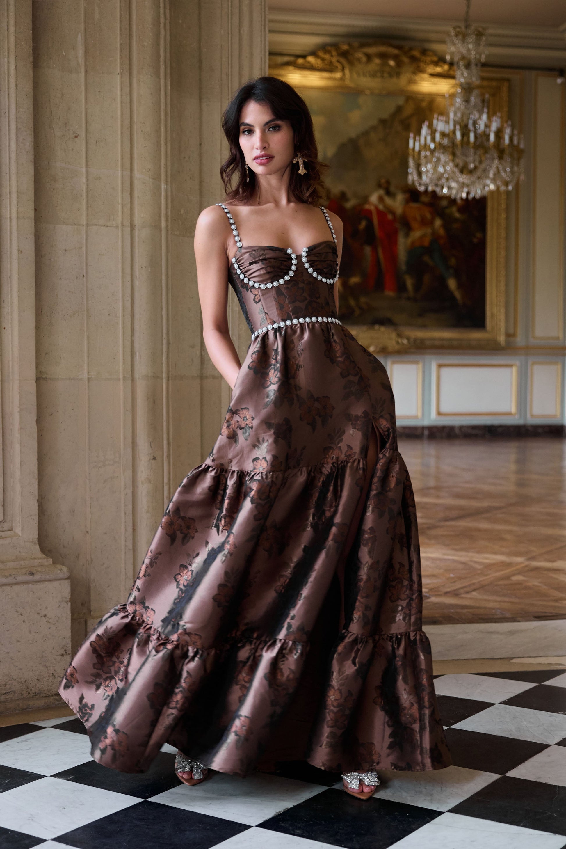 Introducing The Lucetta Dress! She's a dreamy corset gown featuring beautifully gathered cups and gathered skirt tiers. She flaunts a side-front slit, invisible zipper, and side-pockets! She's made from our Cocoa Baroque Floral brocade, which features brown flowers on a brown background. She's elegant, sophisticated, and a timeless treasure.