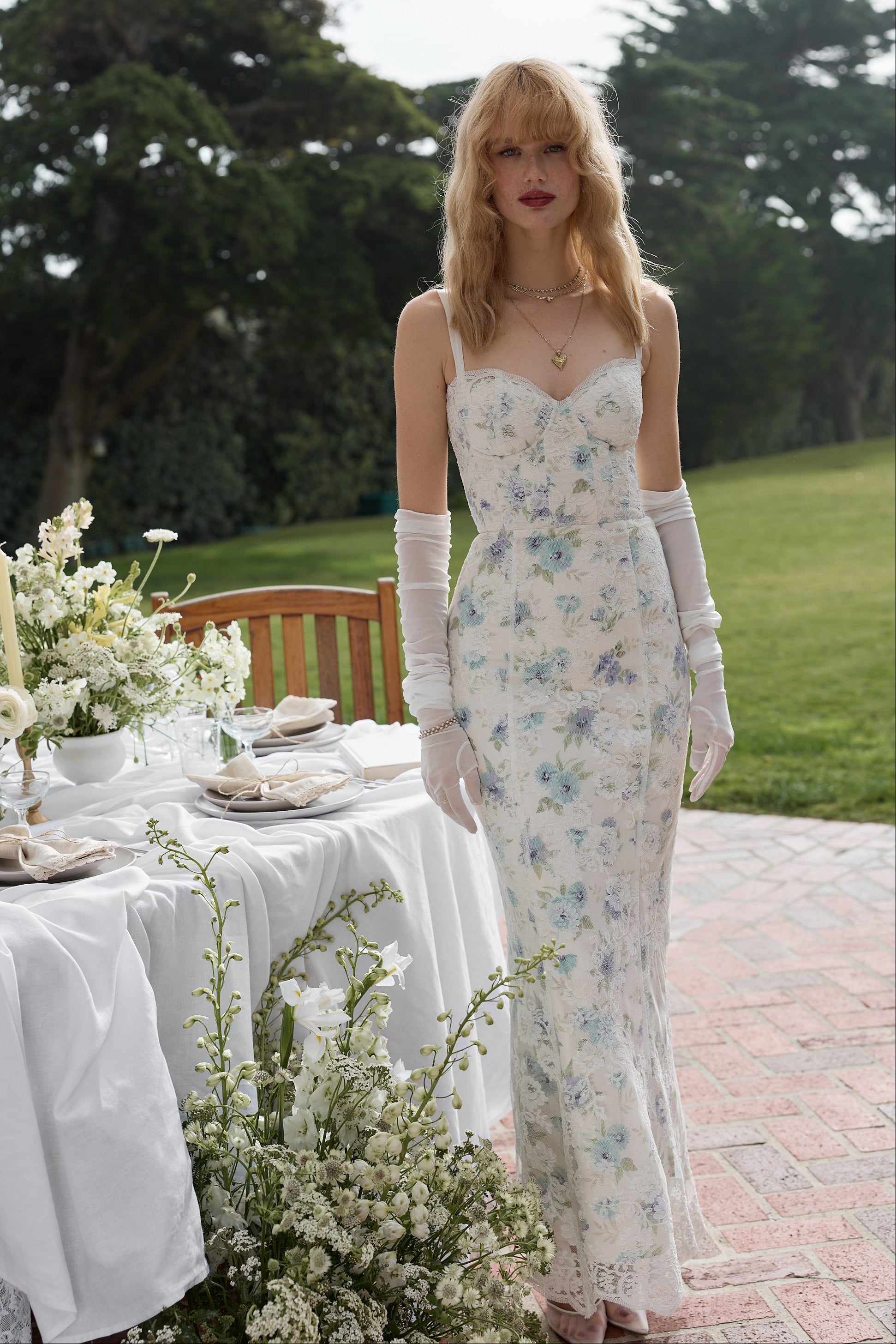 Meet Ruby! She's a fitted corset full-length gown. She features a center back slit, back lacing, and adjustable elastic straps. She's made in our Blue Watercolor Floral, which features blue and teal florals on a cream background, and overlaid with our hand-corded Chantilly lace. Fall in love with this extra special, beautifully laced watercolor dream!