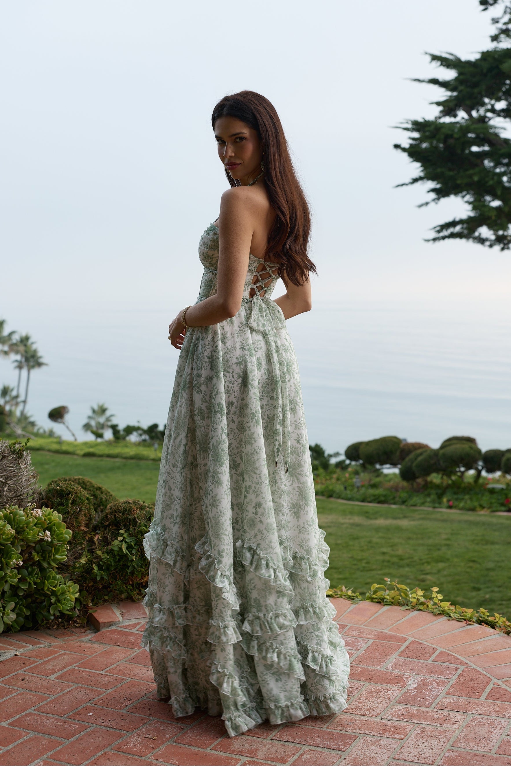 Introducing The Scarlette Dress! She's a stunning halter corset gown accented with braided trim. She flaunts a beautifully gathered skirt, gathered bust, and is made in our Sage Toile textured organza, which features sage florals on a soft-white background. Finished with dreamy ruffle details, side-front slit, and laced corset back, she'll surely turn heads.