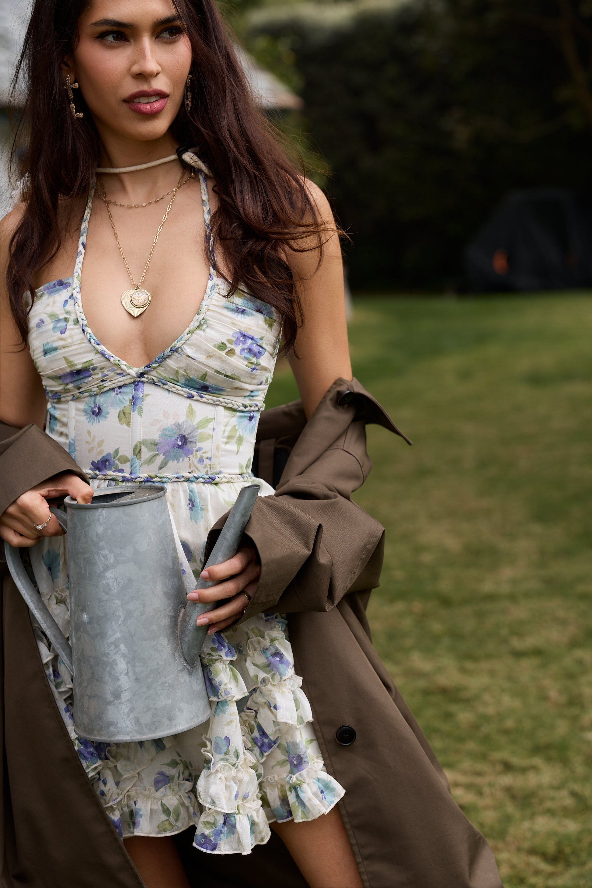 Meet Sophie! She is a gorgeous halter mini dress. She features a stunning corset bodice, beautifully gathered skirt with zigzag and straight rows of delicate ruffle details, and an invisible zipper. She is made in our stunning Blue Watercolor Floral linen, which features blue and teal florals on a cream background, and is oh so very sweet!