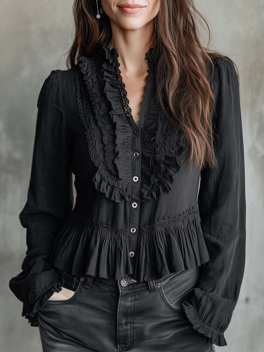 The Vintage-Inspired Black Ruffle Button Blouse is a must-have for those who appreciate classic fashion with contemporary touches. Its refined design and versatile nature make it suitable for both professional settings and casual outings, ensuring you'll reach for this piece time and again.